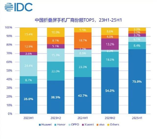 机哥今天被一份数据震惊了!IDC最新报告显示,2025年上半年中国折叠屏市场,华为独占75%份额出货量高达374万台。这是个什么概念?相当于每卖出4台折叠屏手机,就有3台是华为!
